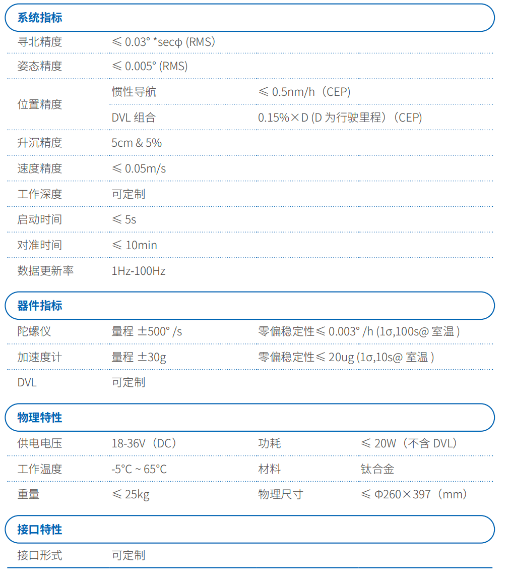 F990SD 是一款自主研發(fā)的精度高一體式耐壓光纖慣性導(dǎo)航系統(tǒng),可實(shí)現(xiàn) 0.03°的自尋北, DVL 組合導(dǎo)航精度可達(dá) 0.15 %*D。